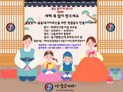 2025년 설날 음식만들기 나누기 ♥ 새뱃돈과 설날 취약계층돕기 성금 후원해 주실 분은 신한은행 100-0··· 2025.01.25 ~ 2025.01.25